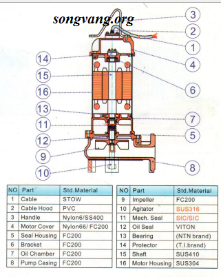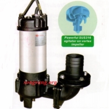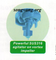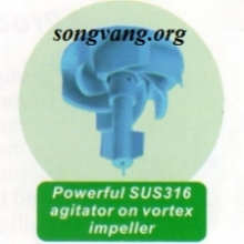 - Cánh bơm được thiết kế vừa dạng xoắn trên đầu có gắn cánh khuấy nhỏ làm bằng SUS316 giúp khuấy trộn bùn trong khi bơm nước thải tráng trường hợp tắc do bùn quá dày và nặng.