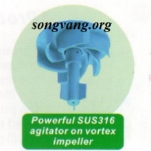 - Cánh bơm được thiết kế vừa dạng xoắn trên đầu có gắn cánh khuấy nhỏ làm bằng SUS316 giúp khuấy trộn bùn trong khi bơm nước thải tráng trường hợp tắc do bùn quá dày và nặng.