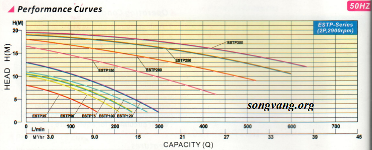 + Lưu lượng và cột áp của bơm hồ bơi ESTP 35.