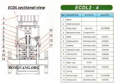 +Sơ đồ cấu tạo và vật liệu bơm trục đứng đa tầng cánh model ECDL2-2.