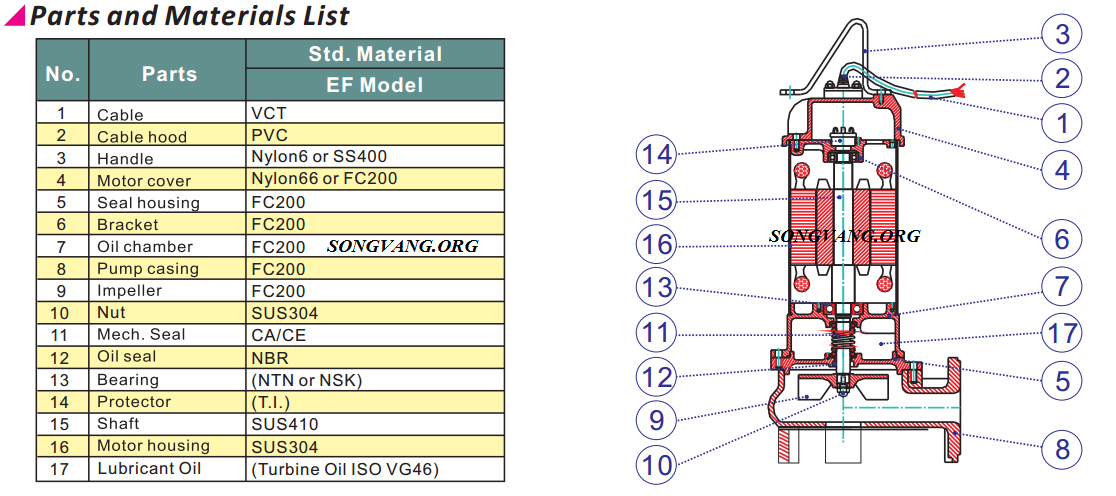 + Vật liệu cấu tạo của bơm chìm model EF-10T.